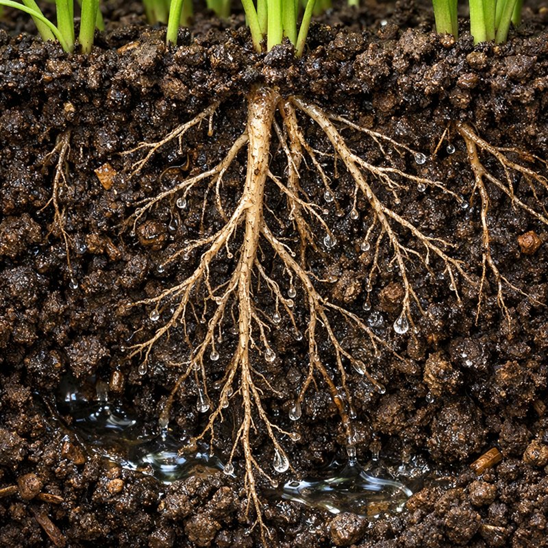 The soil maintains a healthy, vibrant, hydrated texture. Roots are visibly more robust as they tap into the long-term moisture reserves, leading to superior crop resilience.